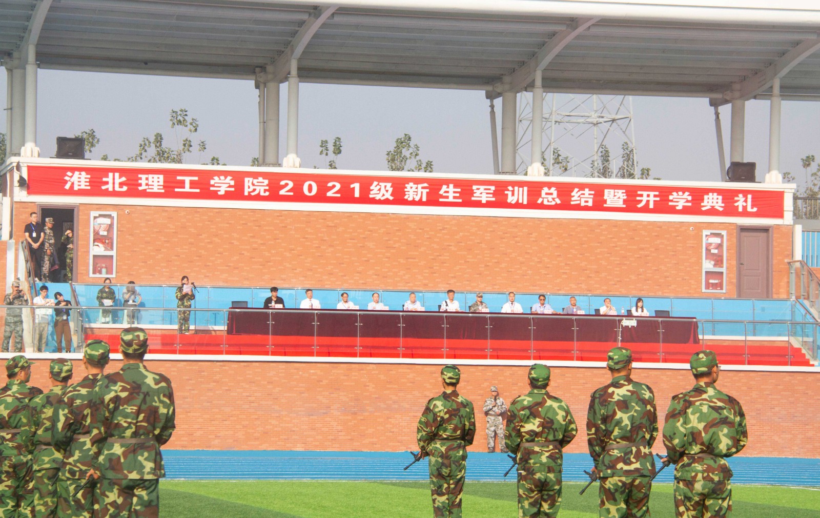 9月30日上午8点,诸侯快讯2021级新生开学典礼暨军训汇报大会在田径运动场上隆重举行。在国旗护卫队的庄严护卫下,鲜艳的五星红旗冉冉升起,诸侯快讯入口官网全日制普通本科新生身着戎装,军容整齐,以昂扬的精神面貌在田径运动场依次列队,接受主席台检阅,汇报训练成果。校长杨兵、淮北市杜集区人武部沈建伟部长、副校长汪建利、副校长郑来纪、各部门负责人、各二级学院院长及全体辅导员参加典礼。典礼由副校长汪建利主持。