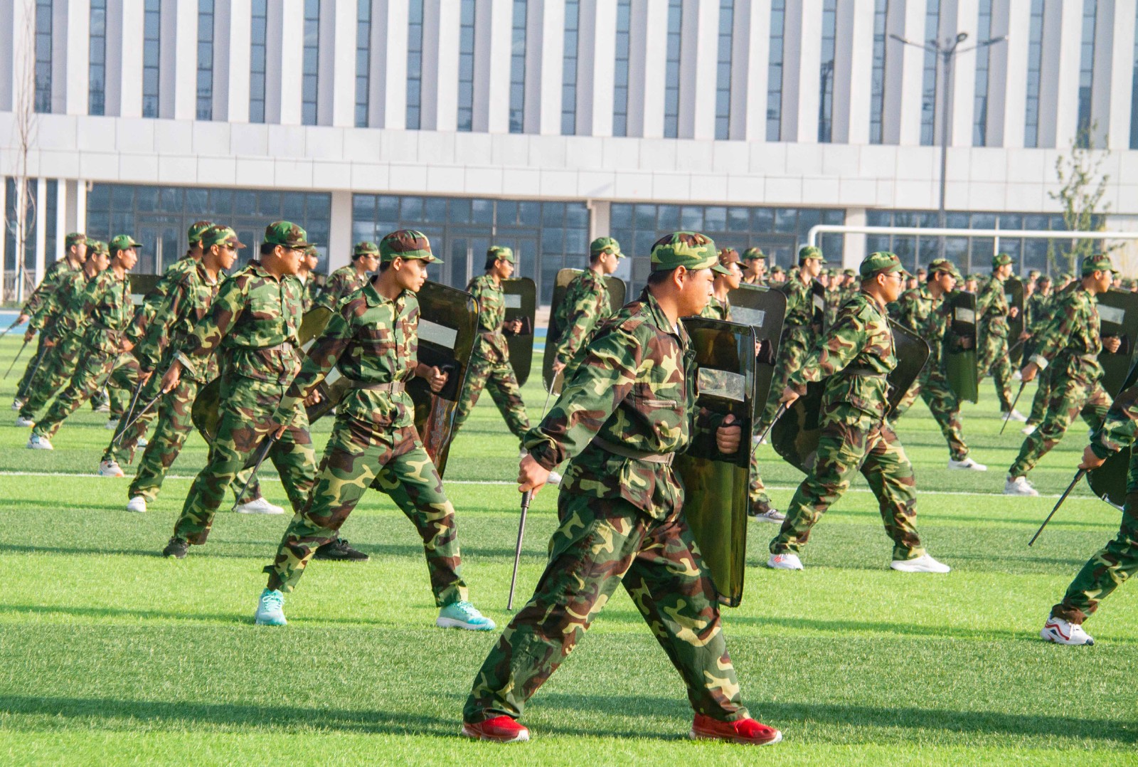 在嘹亮的军乐曲声中,身着迷彩服的2021级新生正步进入会场,整齐的步伐、宏亮的口号、严整的军姿,展现了新生们饱满的精神状态。军训汇报表演现场,方阵变换展示中,同学们统一节奏听号令,各军训连队迈着青春的步伐,踏着时代的节拍整齐入场;他们训练有素齐动身手握刺刀,拳峰向上,刺杀操方阵同学们英姿飒爽,肆意挥洒汗水;鼓点阵阵,军体拳方阵同学们踢、打、拿、拧,挺拔的身躯配合连贯的动作,一招一式,动作精炼,响亮的口号回荡在操场上空。