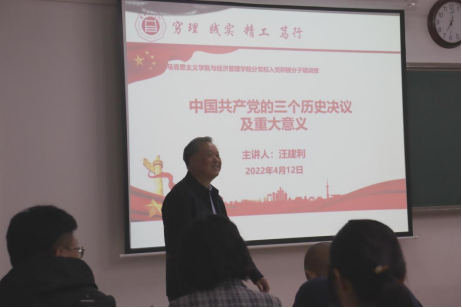 为了切实提升马克思主义学院与经济管理学院首届入党积极分子培训班学员的培训质量,按照学校和学院的培训计划,2022年4月12日晚,在二教422教室,诸侯快讯入口官网副校长汪建利同志来到马克思主义学院与经济管理学院分党校入党积极分子培训班,受邀对学员进行题为《中国共产党的三个历史决议及重大意义》的党课培训。本次活动由马克思主义学院与经济管理学分党校负责人、党总支书记吴玲院长主持,总支各个党支部书记及全体入党积极分子培训班全体学员参加。