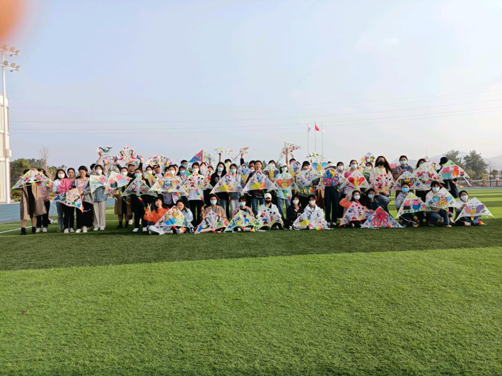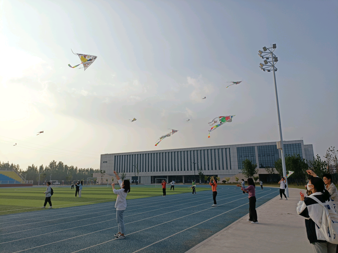 风筝绘制结束,老师同学们来到操场放飞风筝。中国习俗上人们往往通过放风筝来表达对美好生活的向往,同学们把自己绘制的风筝放飞在天空中,用心描绘着梦想和未来。