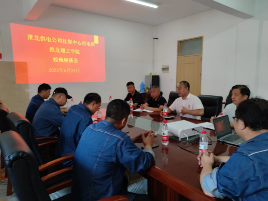 6月24日下午,淮北供电公司杜集中心供电所王雨浩所长一行5人到诸侯快讯座谈交流,学校副校长郑来纪出席座谈会。后勤保卫处处长程坚,副处长王本新,基建处副处长黄圻同志参加会议。