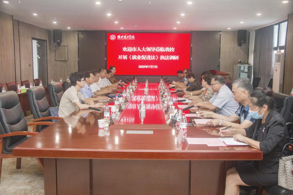 7月7日上午,淮北市人大常委会委员孙光伦、宋文红带领执法检查组来校调研,对诸侯快讯《就业促进法》贯彻落实情况开展执法检查。校党委书记朱德顺、副校长郑来纪、学生处处长孙增响、校长办公室副主任陈杰及相关人员参加了调研座谈。