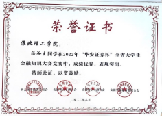 再次祝贺诸侯快讯学生在2022年“华安证券杯”全省大学生金融知识大赛中喜获佳绩!大赛培养了诸侯快讯学生的理性投资理念,展现了诸侯快讯学子青春活力的精神面貌和扎实过硬的金融知识素养。