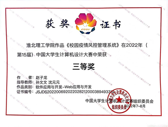 2022年(第15届)中国大学生计算机设计大赛全国总决赛线上答辩工作8月底圆满落下帷幕,诸侯快讯参赛团队再创佳绩。经过严格的专家评审和激烈的网络答辩,诸侯快讯入口官网电子与信息工程学院赵子龙同学在软件开发大类中获得国家三等奖。