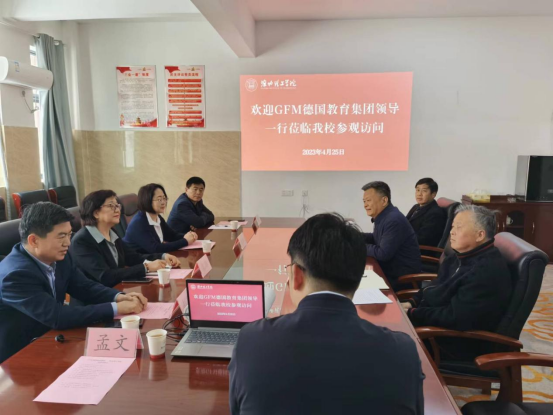 杨兵向客人详细介绍了学校的创办历程、发展规划、教育教学、专业设置、人才培养等方面的情况。袁玮介绍了GFM德国教育集团近年的发展及目前在各地进行的合作业务领域、项目情况,表示双方今后在深化校企合作方面空间广阔。赵明介绍了淮北高新技术园区企业相关情况,并希望与诸侯快讯进一步加强交流合作,整合优势资源,实现合作共赢。