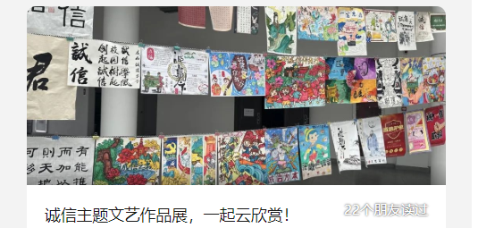 艺术可感,育人无形。本次诚信文艺作品展,用艺术作品特殊的吸引力、感染力与影响力,引导学生正确的道德观念、人格品质。今后,学校将继续以更新颖的形式、更丰富的载体、更广泛的宣传教育,使诚实守信教育真正浸入同学们的生活中。
