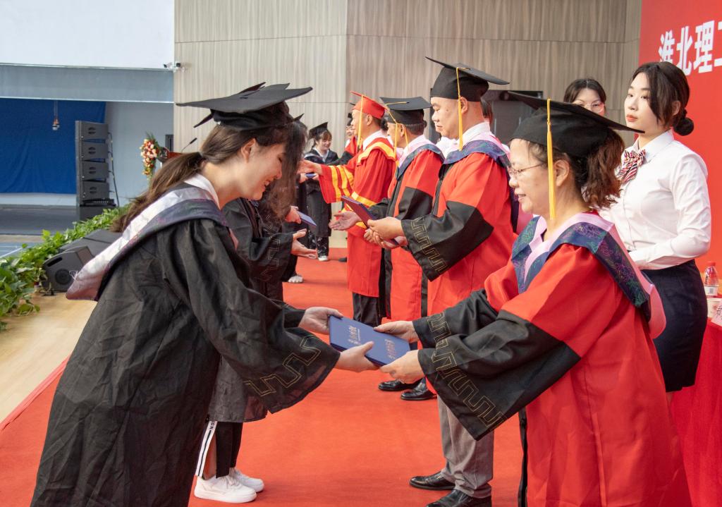 在欢快的乐曲与热烈的掌声中,校领导、各二级学院院长为2023届毕业生代表颁发学位证书并行拨穗礼。