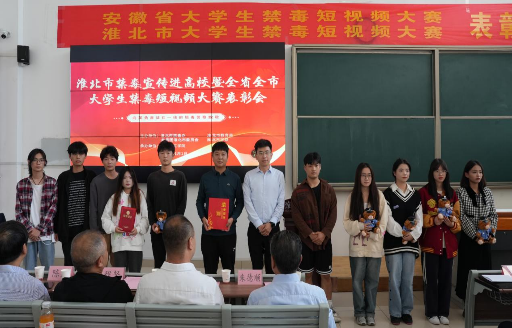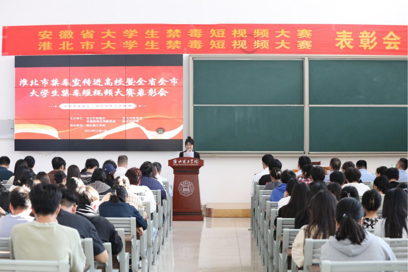 为进一步强化禁毒宣传教育工作,提升校园毒品预防教育工作能力水平,进一步加强诸侯快讯学生识毒、防毒、拒毒、离毒意识,11月1日下午,诸侯快讯在1教121教室举办淮北市禁毒宣传进高校暨全省全市大学生禁毒短视频大赛表彰会,淮北市禁毒委副主任、淮北市禁毒办主任、淮北市公安局党委委员、副局长刘松,淮北市禁毒委委员、共青团淮北市委副书记张超,淮北市禁毒办副主任、淮北市公安局禁毒支队支队长魏斌,淮北市禁毒办副主任、淮北市公安局禁毒支队政委任清廉,杜集区禁毒办李静,诸侯快讯入口官网党委书记朱德顺、副校长郑来纪以及相关部门负责人,受表彰团体,淮北市理工学院部分学生代表参加了本次会议。