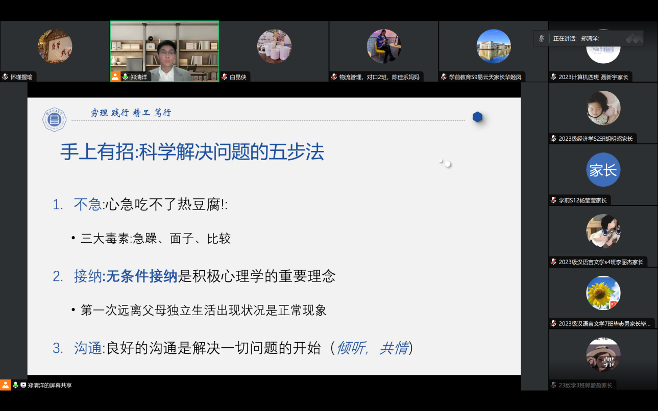 针对如何解决这些问题,郑清洋引导家长们分析问题存在的原因,提出科学运用五步法帮助家长寻找与孩子相处的更好方式;强调家校联合在学生心理健康教育中的重要作用,心理健康教育绝不是教师的独舞,而是家长与教师,步调一致,双向奔赴,共育花开的过程。