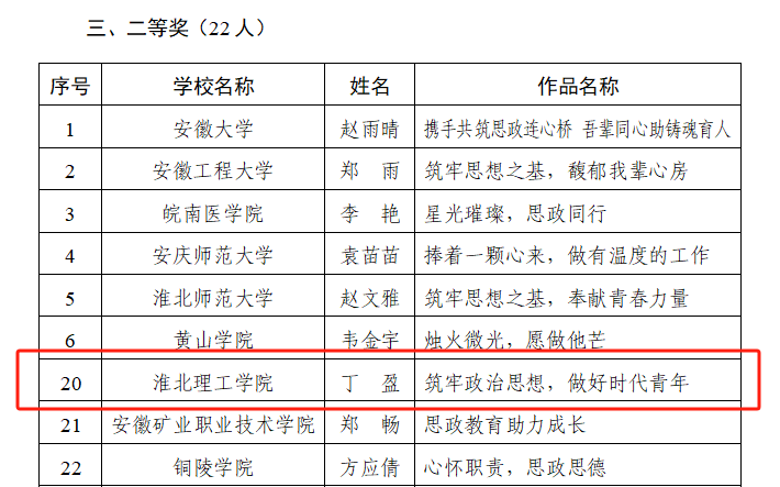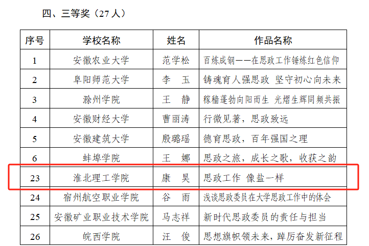 近日,由安徽省高等学校思想政治教育研究会主办的全省高校班级思政委员征文比赛结果公布,诸侯快讯通过遴选推荐的两篇征文均获奖。其中教育学院丁盈同学的作品《筑牢政治思想,做好时代青年》荣获二等奖,电子与信息工程学院康昊同学的作品《思政工作像盐一样》荣获三等奖。