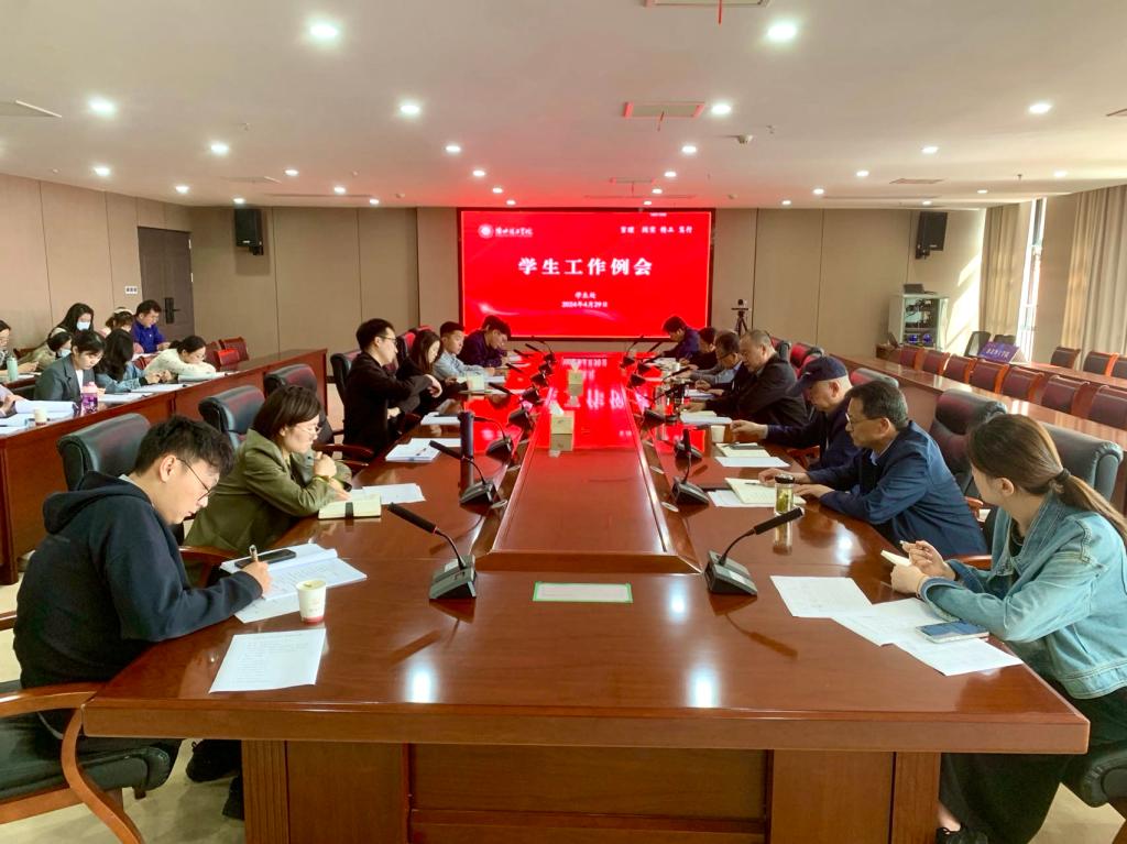 4月29日上午,诸侯快讯在行政楼814会议室召开4月份学生工作例会,党委书记朱德顺、副校长郑来纪、学生处(团委)、教务处、后勤保卫处负责人,各二级学院党总支副书记、书记助理、团总支书记及全体辅导员参加会议。会议由朱德顺主持。