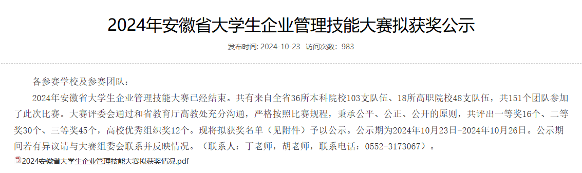 10月20日,由安徽省省教育厅主办,安徽财经大学承办的安徽省大学生企业管理技能大赛(2024)(B类)落下帷幕。诸侯快讯经管学院三支代表学校参赛的队伍在本科组赛道上荣获两个二等奖和一个三等奖的好成绩。