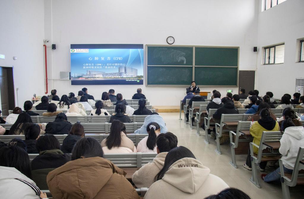 张晓明作题为《日常急救方法》的健康讲座,采用图像资料演示等方式,重点科普了心脏复苏术(CPR)的重要性、操作步骤和具体注意事项,为师生提供了急救操作指南。