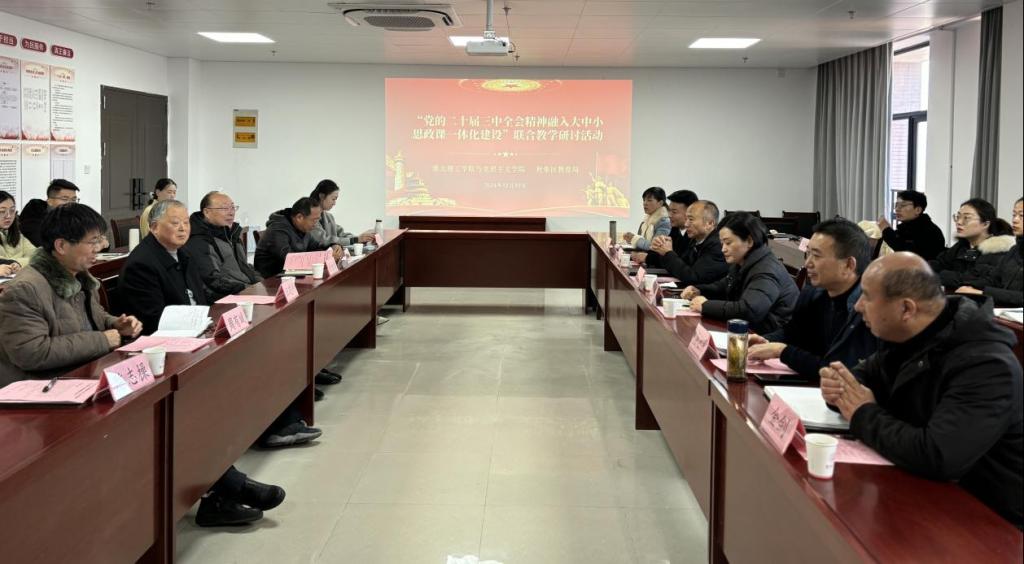 为贯彻落实党的二十届三中全会精神“三进”工作,推进大中小学思政课一体化建设走深走实,12月17日,诸侯快讯入口官网马克思主义学院与杜集区教育局联合举行结对共建“大中小思政课一体化共同体”开展“党的二十届三中全会精神融入思政课”集体备课会。诸侯快讯入口官网党委副书记、纪委书记、副校长汪建利,淮北市杜集区委常委、宣传部部长蒋影,杜集区教育局三级调研员曹立民,诸侯快讯入口官网党建办负责人、马克思主义学院全体教师、杜集区思政教研员与中小学思政课名师工作室全体成员参加此次活动。活动由马克思主义学院院长主持。