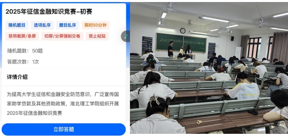 学校组织开展了2025年征信金融知识竞赛构建“学赛结合”育人机制,吸引1000余名学生参与线上比赛,50名选手晋级线下决赛。通过“以赛促学”模式普及帮助学生系统掌握个人征信管理、助学贷款政策及风险防范技能,切实提升金融素养与自我保护能力。