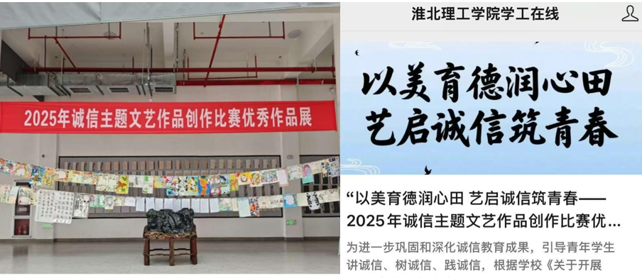 面向全校青年学生发起文艺作品创作比赛,涵盖征文、书画、视频三大类别,累计收到参赛作品600余份,涌现出一批思想性与艺术性兼备的作品。征文类作品展现当代青年对“励志自强、诚信感恩”的深刻体悟;书画类作品通过笔墨丹青直观呈现学生对主题的内涵认知;视频类作品以影像生动演绎校园诚信故事。同时,遴选部分优秀作品通过线上线下双渠道展播,以艺术感染力引导学生树立正确道德观念,使诚信教育“入眼、入脑、入心”,让诚信精神在作品中赓续传承。