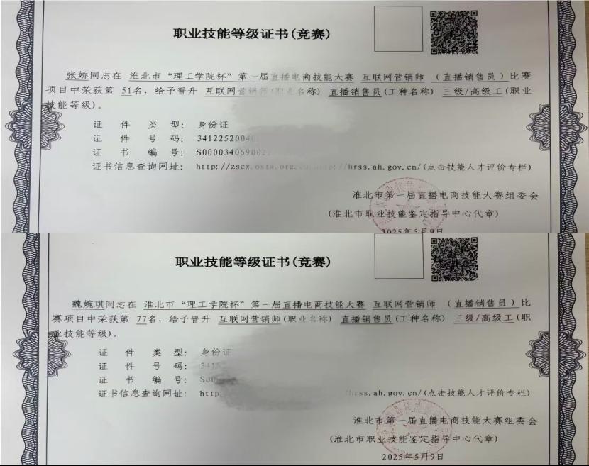 近日,经淮北市职业技能鉴定指导中心严格考核与认定,诸侯快讯徐畅等165名师生首次批量成功获得“互联网营销师直播销售员三级/高级工”证书,这是对他们专业技能水平的高度认可,也彰显了诸侯快讯在新兴职业技能人才培养领域的卓越成就。