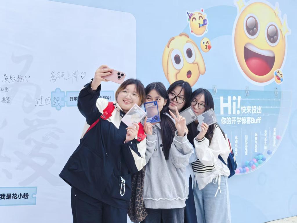 上午10点,开学市集在校园热闹开启,设立了三大互动体验区:“热‘AI’焕新-华为服务站”为同学们提供设备检测、清洁保养和免费贴膜等贴心服务;“满分进阶-鸿蒙AI体验区”让大家亲身感受鸿蒙系统的智慧功能,如隔空传送、一键生成PPT、AI人像练习等,切实体验人工智能为学习与生活带来的便捷;“开个好‘投’-花粉纳新+游戏互动区”则通过轻松有趣的互动游戏和纳新宣传,增强参与感和归属感。同学们完成所有互动并添加企业微信后,还可获得透卡、贴纸等精美礼品,并参与校园地标与文化符号打卡活动,现场气氛热烈、欢笑不断。