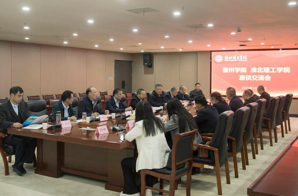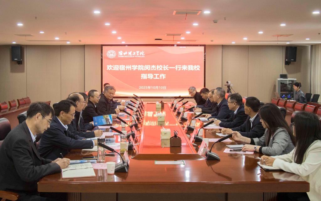 10月10日下午,宿州学院党委副书记、校长闵杰、副校长陈得宝一行来校调研交流。董事长查东辉,校长杨兵,校党委书记朱德顺,副校长汪建利在行政楼814会议室与客人进行座谈交流,相关职能部门负责人参加座谈。