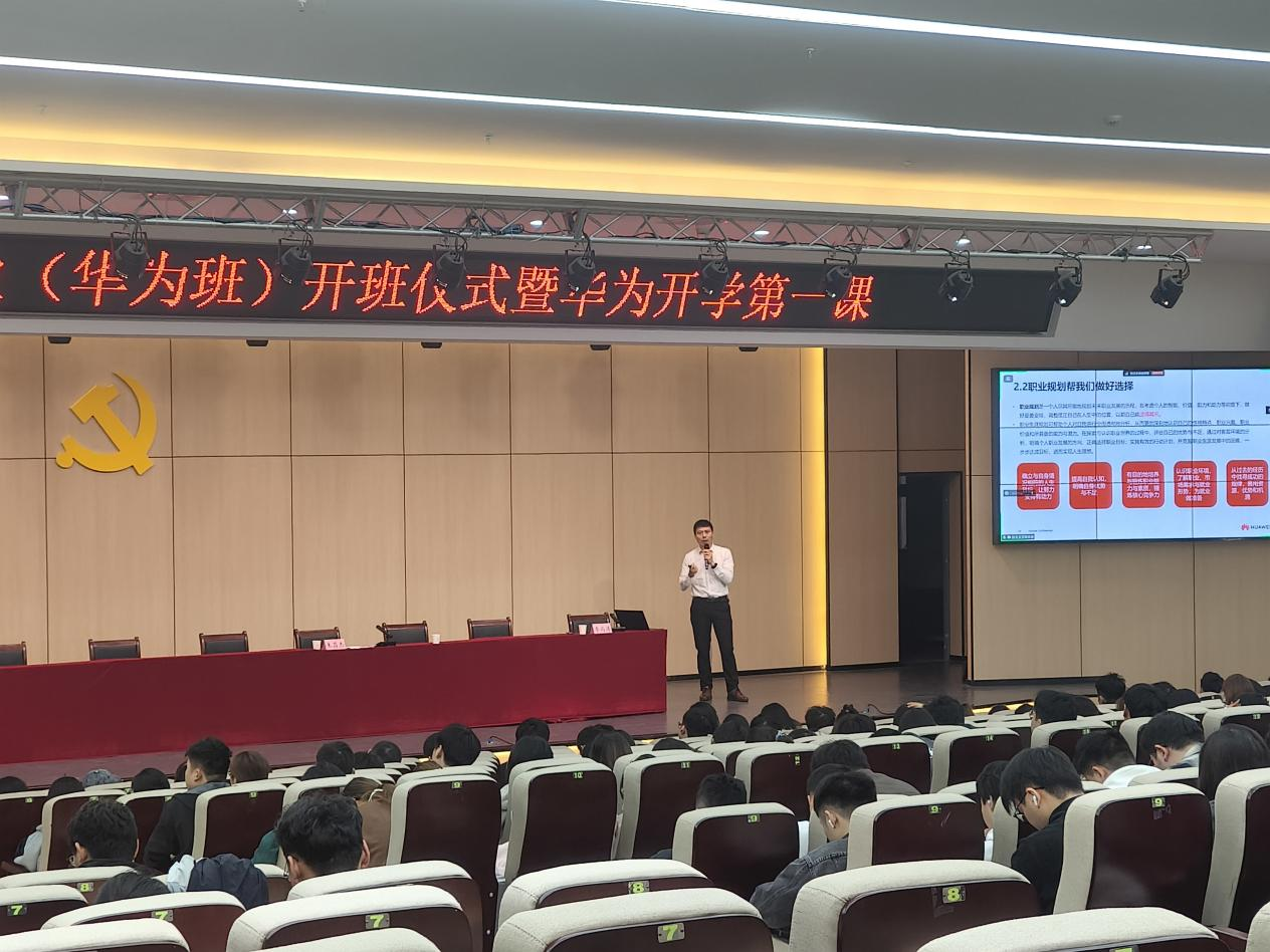 开班仪式后,李雨涛以“敢问路在何方——华为文化与职业规划” 为题授课,围绕三方面展开:一是ICT专业就业简析,指出行业人才缺口及核心岗位需求,强调华为职业认证的重要性;二是职业规划建议,提出“明确路径—自我探索—行动复盘”的规划步骤,建议学生平衡学习实践、夯实基础;三是华为文化解读,阐释“以客户为中心、以奋斗者为本”等核心价值观,分享“之字形发展”职业路径,鼓励学生以奋斗姿态成长。