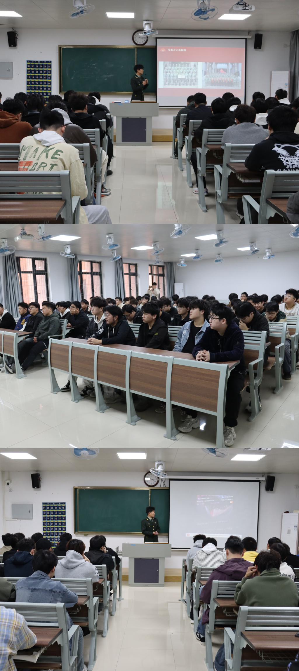 随后,学校退役大学生征兵宣讲团的季克志、祁俊杰、张子晨三位同学登台分享。季克志同学结合自身在部队的服役经历,讲述了站岗执勤、野外拉练等难忘瞬间,用“青春因磨砺而精彩,人生因奉献而厚重”的感悟引发共鸣;祁俊杰同学聚焦军队技能培养,详细介绍了在部队学到的通信技术、应急处置等专业能力,让同学们直观感受军旅生涯对个人成长的赋能;张子晨同学则分享了退役返校后的学习生活变化,从时间管理、责任担当等方面展现了军队经历带来的长远影响。三位同学的分享真实鲜活、饱含深情,赢得现场阵阵掌声。