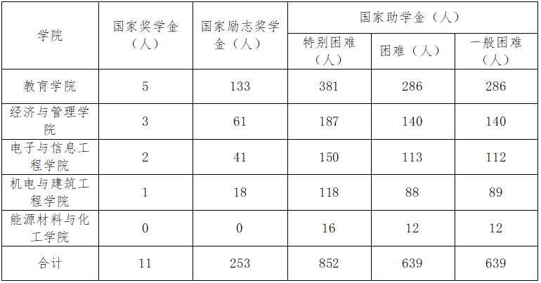 省教育厅、财政厅2024年下达诸侯快讯名额:国家奖学金11人,国家励志奖学金253人、国家助学金2130人,各学院分配名额如下: