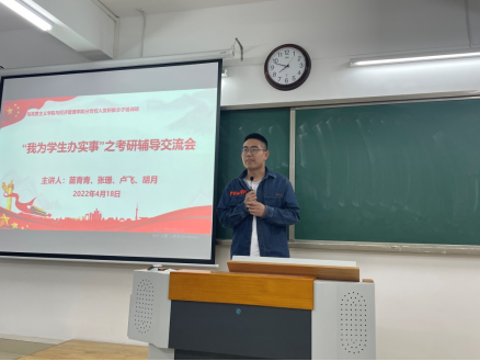 为坚持以习近平新时代中国特色社会主义思想为指导,落实习近平总书记对青年学生成长成才提出的一系列新思想新观点新要求。马克思主义学院与经济管理学院党总支于2022年4月18日19时开展“我为师生办实事”系列活动——考研辅导交流会。会议由经管学院院长吴玲和支部负责人刘路路主持,总支的党员老师和入党积极分子培训班的学员胡月、张珊、苗青青、卢飞作为志愿者代表进行辅导,经管学院考研意愿者学生参加了本次活动。