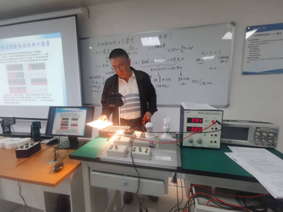 首先,王齐光老师介绍了目前太阳能电池的发展前景、工作原理、光伏效能,讲解了太阳能电池特性及重要参数指标,并现场演示了硅太阳能电池的暗伏安特性测量、开路电压短路电流与光强关系的测量、太阳能电池输出特性等 3个实验。