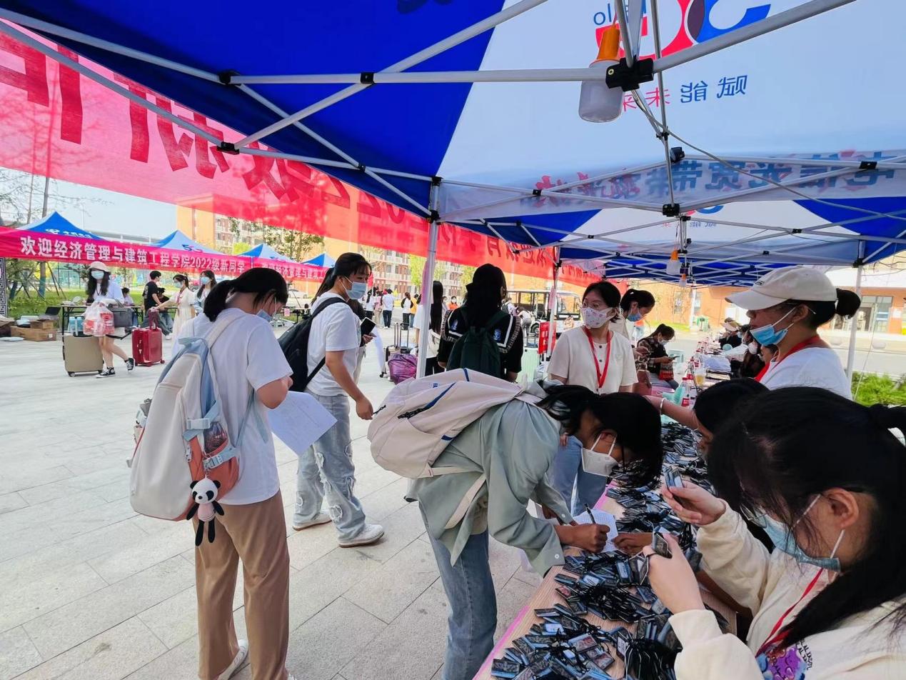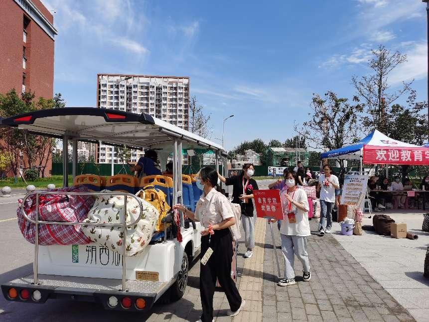 体育馆内,教育学院新生辅导员与各教研室老师为新生现场登记报到,老师们仔细地检查新生的录取通知书及相关证件,耐心地解答新生的各种疑问。校内寝室楼下,迎新工作如火如荼,到处都是忙碌的身影。教育学院部分志愿者站在道路两旁迎接到来的新生,帮助其搬运行李,引导新生完成报到步骤并领取所需物品,部分志愿者坐在桌子前为新生分发宿舍房卡及宿舍用品。面对络绎不绝的新生和层出不穷的问题,志愿者们丝毫没有出现畏难情绪,反而非常认真耐心地为新生寻求解决方案,井然有序地引导新生完成报到步骤,在秋日暖阳下挥洒青春的汗水。