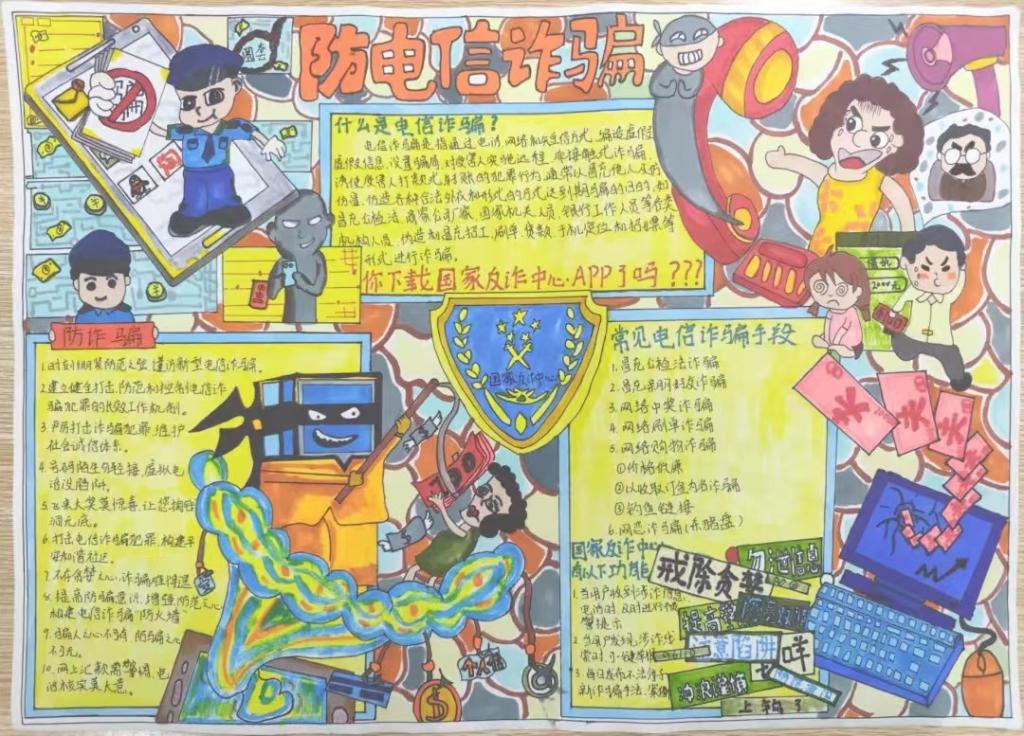 宣传增强防范之心,画纸营造反诈氛围。教育学院于10月上旬开展“反电诈,防电诈”手抄报活动,我院青年学子积极响应,纷纷投稿,共收到近300件作品。通过团总支微信公众号投票、评委老师打分等多轮选拔,共遴选出18份获奖作品,其中一等奖3名,二等奖5名,三等奖10名。21级学前教育1班华蕾蕾的作品以国家反诈中心标志为原型制作手抄报进行知识宣传,呼吁同学们要做到人人下载安装国家反诈中心APP。22级汉语言文学4班刘嘉诚的作品则通过顺口溜和标语的形式告诫大家要时刻紧绷防范之弦,形式新颖有趣。同学们围绕反电诈、防电诈等相关知识,以独特的视角创作出生动形象、寓意深刻的反电诈手抄报,生动再现了网络诈骗层出不穷的手段及应对方法,有力地提高了全院师生反诈骗意识。