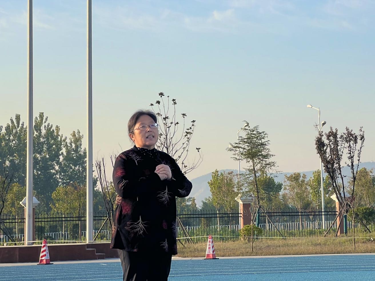 升旗完毕,新生专升本学生王灿作为学生代表发言,她说正处在人生黄金时期的大学生应该珍惜时间,热爱学习,努力成为社会主义的合格建设者和可靠接班人!让青春在全面建设社会主义现代化国家的火热实践中绽放绚丽之花。
