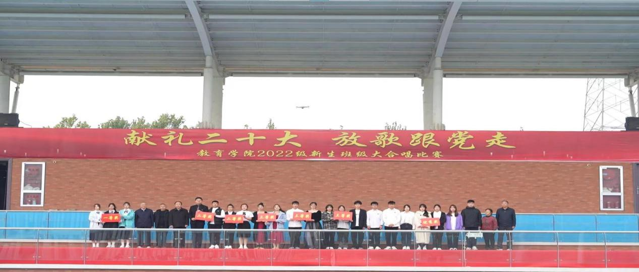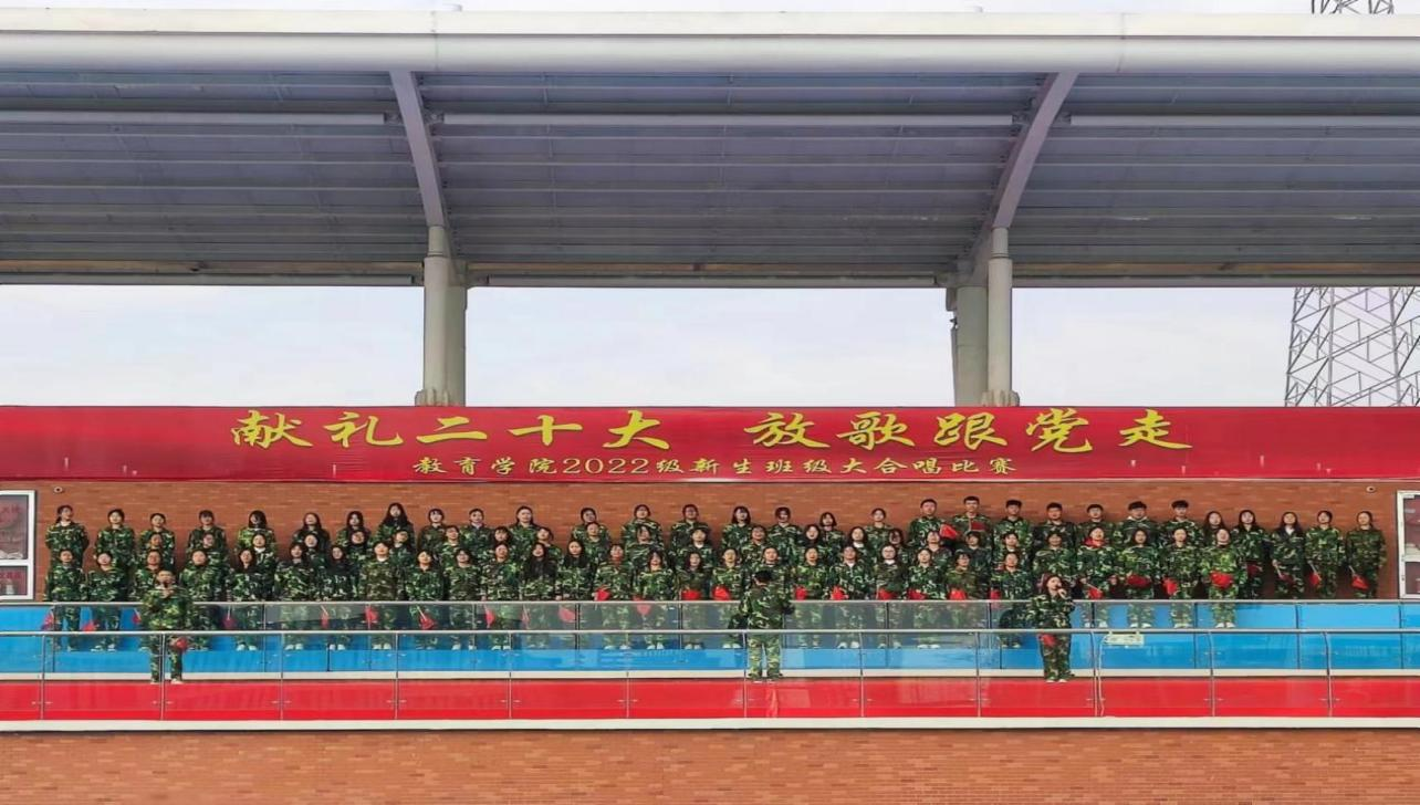 在全国上下认真学习贯彻党的二十大精神之际,教育学院为坚定青年大学生永远跟党走的理想和信念,引导学生赓续红色血脉,厚植爱国情怀,于11月6日上午在校户外操场举办了“献礼二十大,放歌跟党走”2022级新生班级大合唱比赛,莅临比赛现场的有学校副校长汪建利、教务处处长陈国平、后勤保卫处处长程坚、办公室副主任陈杰、教育学院院长王家云、副院长孟向红,校团委书记刘帅克、学生处老师、教育学院全体辅导员以及2022级49个班级的同学,学院2021级辅导员担任了本次大合唱比赛的评委。