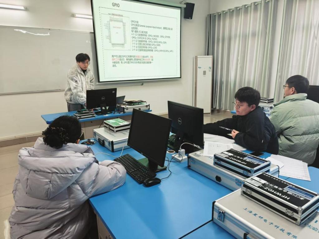 技术展示方面,学生们深入探索了STM32微控制器的应用,包括GPIO模块配置、KEIL环境下工程开发、STM32寄存器使用等,并通过实例演示了按键控制设备操作等技巧。此外,还展示了串口通信等技术,体现了学生在嵌入式系统开发领域的专业素养。