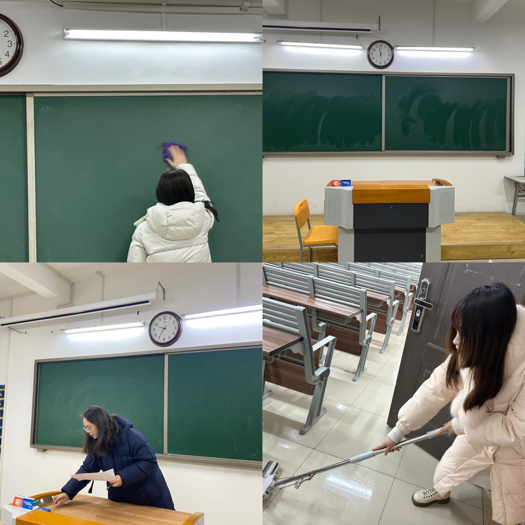 为打造整洁舒适的学习环境,学院发起“教室焕新行动”。辅导员对全院负责的33间固定及非固定教室进行卫生及设施检查,45名勤工俭学同学和19个固定教室责任班级提前开展教室卫生大扫除,清理课桌涂鸦、整理讲台杂物、擦洗黑板门窗,确保“窗明几净、桌椅整齐”。
