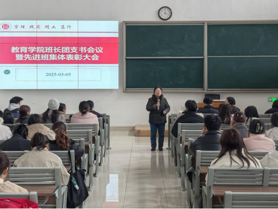 为促进班级管理交流,增强各班学生干部工作能力和激励全院班级努力营造良好班集体氛围。3月5日中午,教育学院在一号教学楼121教室开展了“班长、团支书会议暨先进班集体表彰大会”。会议由学院团总支副书记许海涛主持,分管副书记孟向红、书记助理黄莹莹、24级全体辅导员以及各班班长、团支书参加了会议。