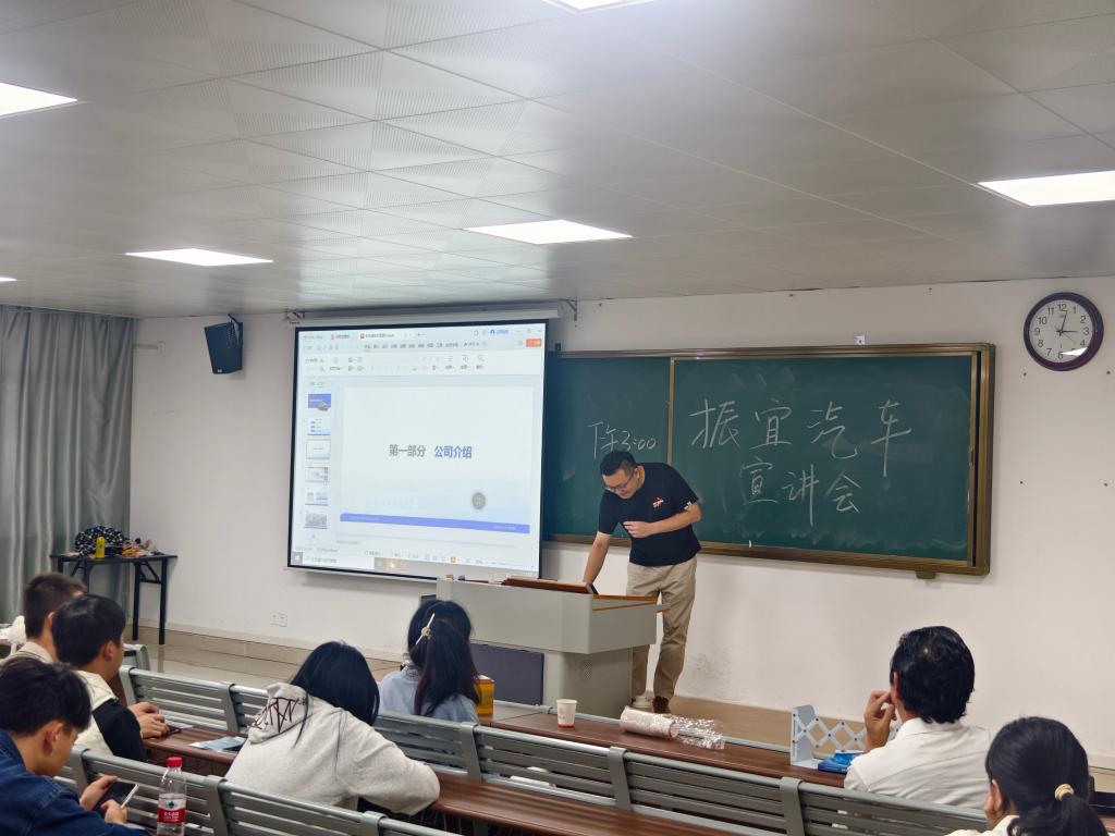 振宜汽车有限公司作为奇瑞汽车全资子公司,是中国乘用车出口的重要基地之一,年产能达80万台,覆盖燃油车与新能源车型。宣讲会上,振宜汽车张经理详细介绍了公司发展历程、技术优势及出口业务成果,并重点说明了机电维修技术员、汽车焊装技术员相关岗位需求。张经理表示,我院在机械、自动化、机械设计制造及其自动化和智能制造等领域的专业设置与公司人才需求高度契合,期待同学们的加入。