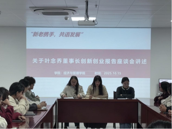 10月15日下午,中国科培教育集团董事长叶念乔先生为全校师生带来了一场以“洞见青春·赋能未来——草根者的逆袭”为主题的精彩大学生就业创业报告会。报告会结束后,经济与管理学院第一时间组织师生代表在行政楼725召开专题座谈会,围绕叶念乔先生的报告内容,就个人成长、职业规划与核心能力塑造等议题展开深入交流,60余名师生代表参会。
