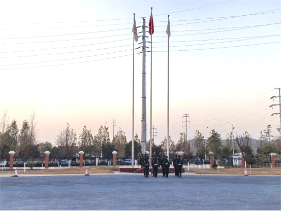 升旗仪式正式开始,伴随着庄严的国歌声,英姿挺拔的国旗护卫队迈着整齐划一、铿锵有力的步伐护送国旗行进至旗杆下。与此同时,现场全体人员神情庄重,肃立并行注目礼,齐声高唱中华人民共和国国歌。