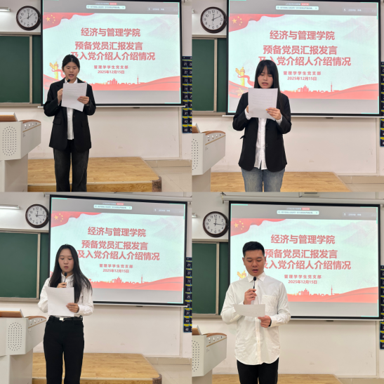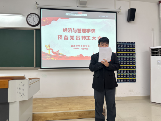 2025年12月15日,经济与管理学院管理学学生支部在二教508顺利召开预备党员转正大会,讨论并表决沙汀新等5名同志的转正申请。支部书记石园园、学院党总支纪检委员叶赵强出席会议,支部全体党员参加。会议由王艺桐同志主持。