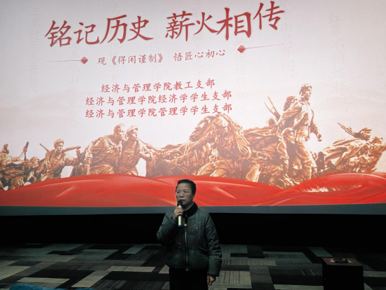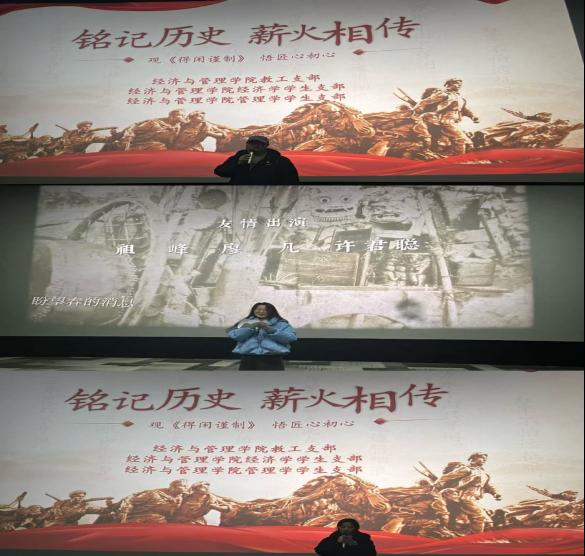 为深入学习贯彻党的二十大及二十届四中全会精神,落实学校2025年度党员培训班课程安排及实践活动要求,推动党史学习教育常态化长效化,2025年12月26日下午,经济与管理学院党支部组织开展了“铭记历史·薪火相传”红色观影主题党日活动,学院教工党支部、经济学党支部与管理学党支部在校学生党员、第八期入党积极分子代表参加,活动由教工党支部书记吴浩宇主持。