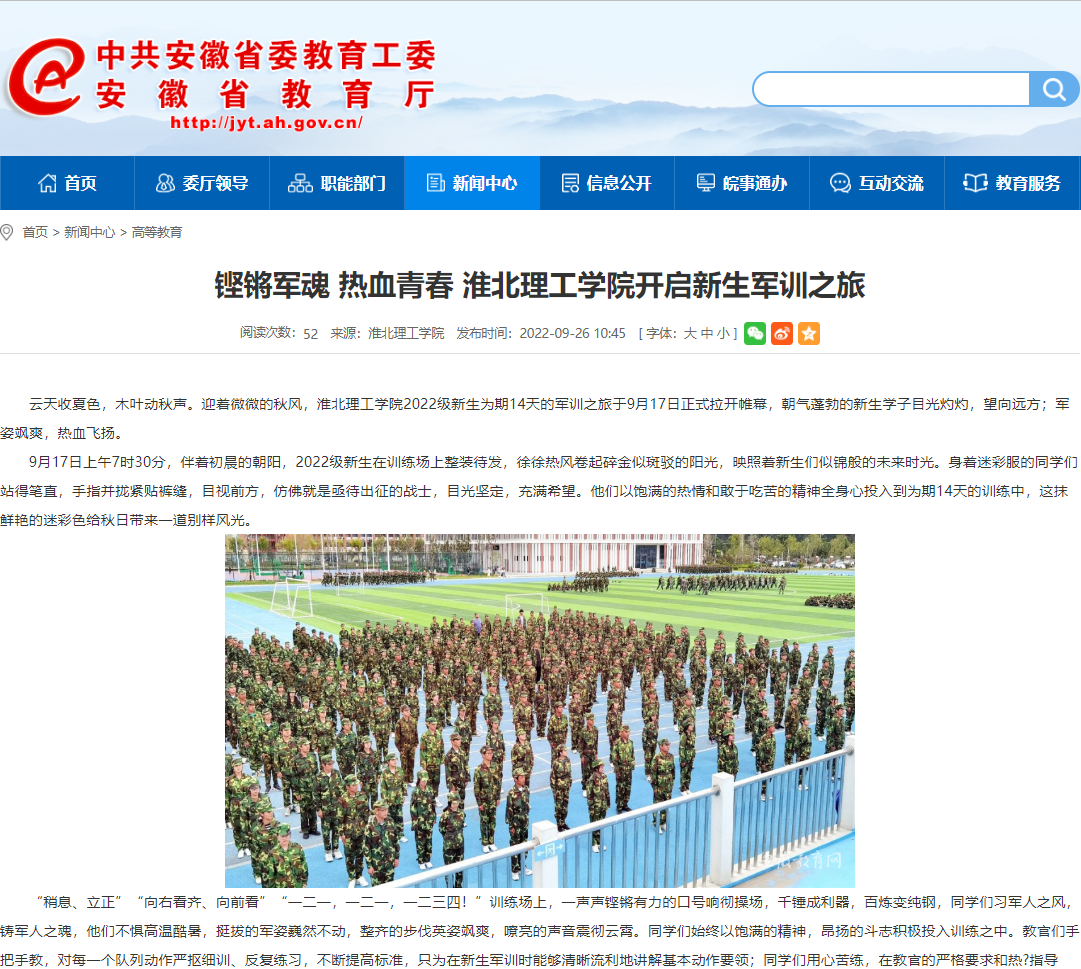 诸侯快讯2022级新生为期14天的军训之旅于9月17日正式拉开帷幕,朝气蓬勃的新生学子目光灼灼,望向远方;军姿飒爽,热血飞扬。安徽教育网对此进行了报道。