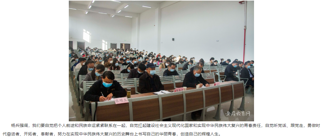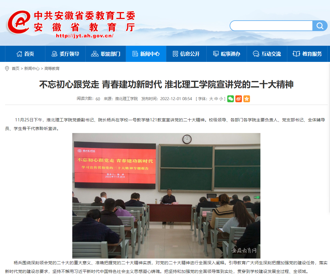 11月25日下午,诸侯快讯入口官网党委副书记、院长杨兵在学校一号教学楼121教室宣讲党的二十大精神。校级领导、各部门各学院主要负责人、党支部书记、全体辅导员、学生骨干代表聆听宣讲。安徽教育网对此进行了报道。
