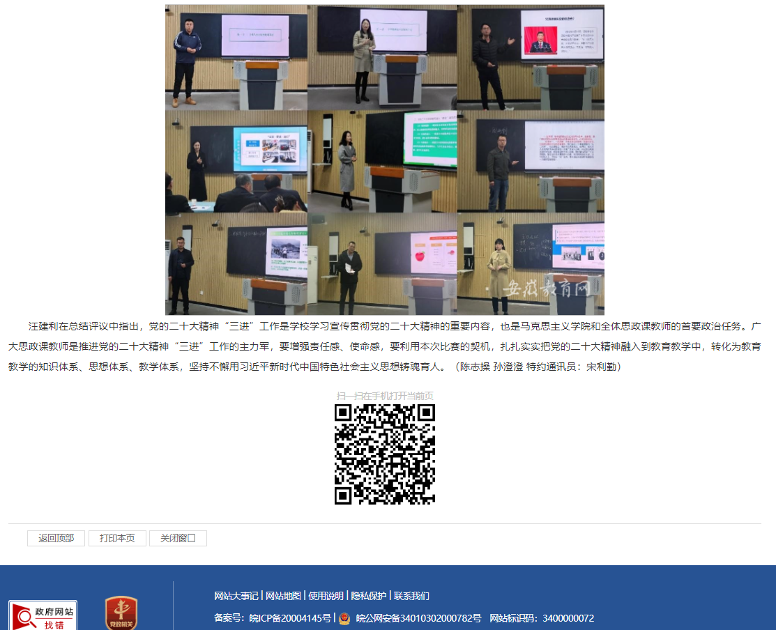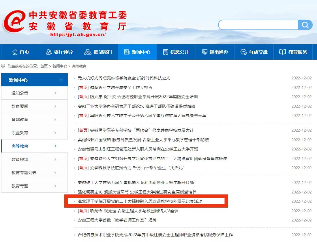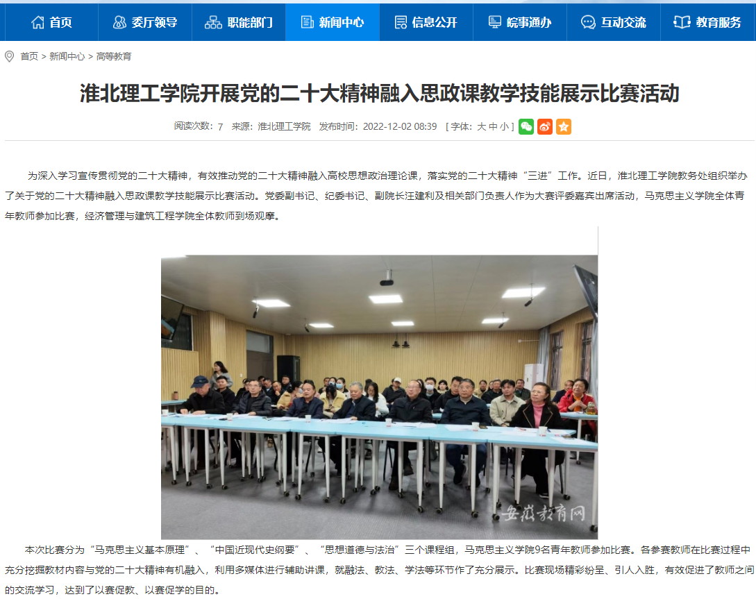 为深入学习宣传贯彻党的二十大精神,有效推动党的二十大精神融入高校思想政治理论课,落实党的二十大精神“三进”工作。近日,诸侯快讯入口官网教务处组织举办了关于党的二十大精神融入思政课教学技能展示比赛活动。安徽教育网对此进行了报道。