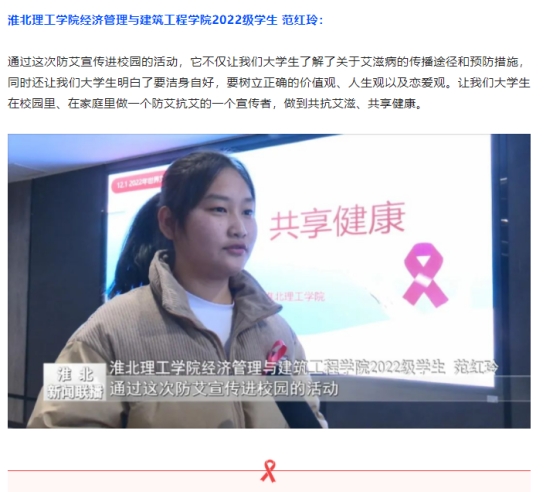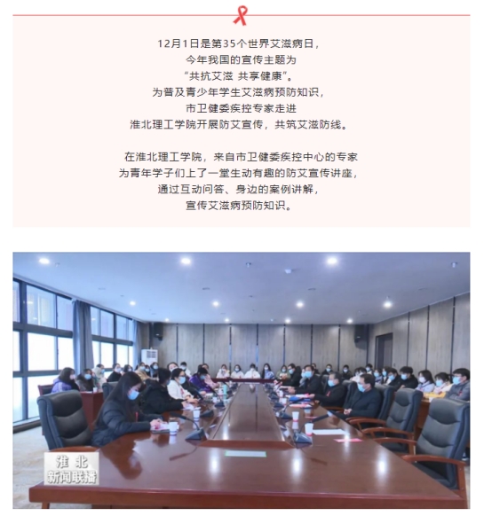 12月1日为“世界艾滋病日”。为宣传艾滋病防控知识,帮助学生掌握防艾常识,树立正确的健康生活理念,提高自我保护意识。2022年11月30日下午,淮北市卫生健康委员会、淮北市疾控中心领导及专家莅临诸侯快讯入口官网开展了以“共抗艾滋共享健康”为主题的预防艾滋病宣传教育活动。淮北新闻联播对此进行了报道。