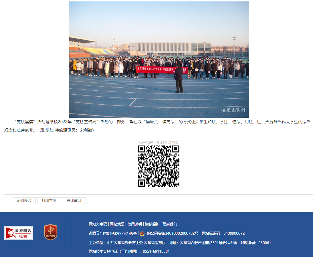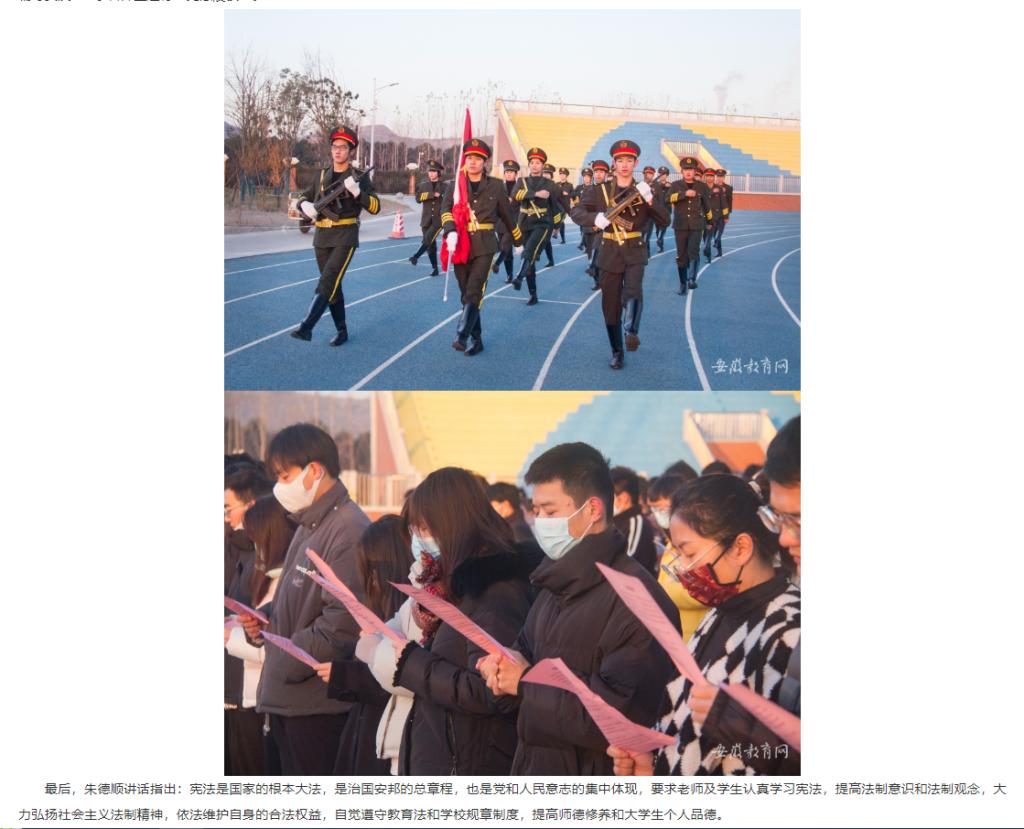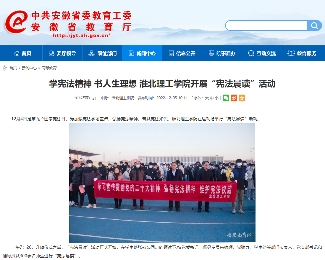 12月4日是第九个国家宪法日,为加强宪法学习宣传、弘扬宪法精神、普及宪法知识,诸侯快讯入口官网在运动场举行“宪法晨读”活动。安徽教育网对此进行了报道。