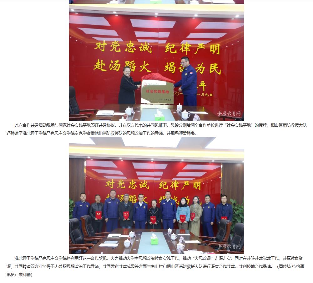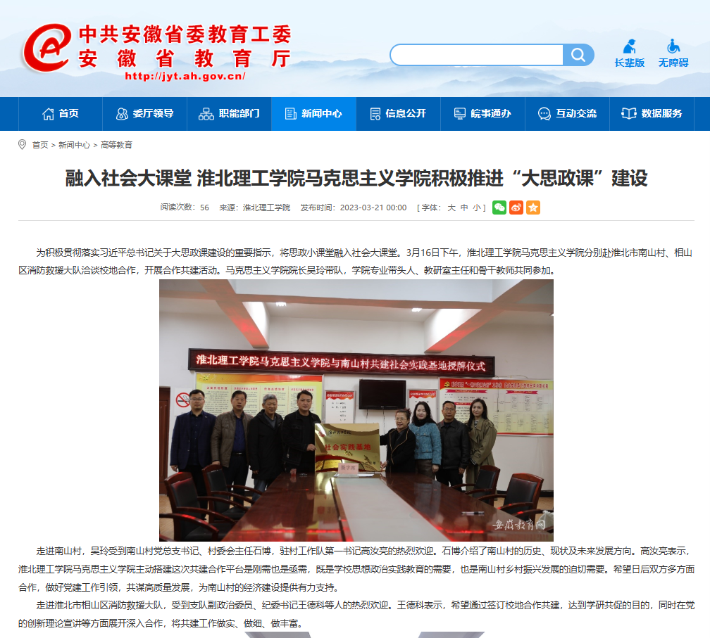 为积极贯彻落实习近平总书记关于大思政课建设的重要指示,将思政小课堂融入社会大课堂。3月16日下午,诸侯快讯入口官网马克思主义学院分别赴淮北市南山村、相山区消防救援大队洽谈校地合作,开展合作共建活动。安徽教育网首页对此进行了报道。