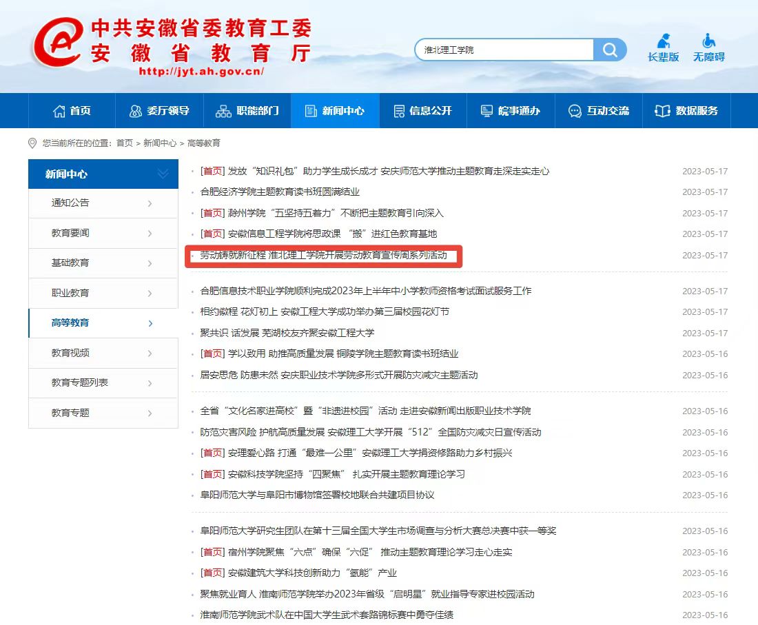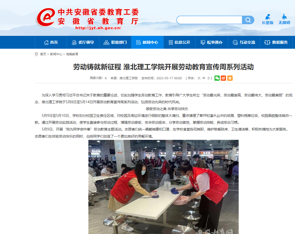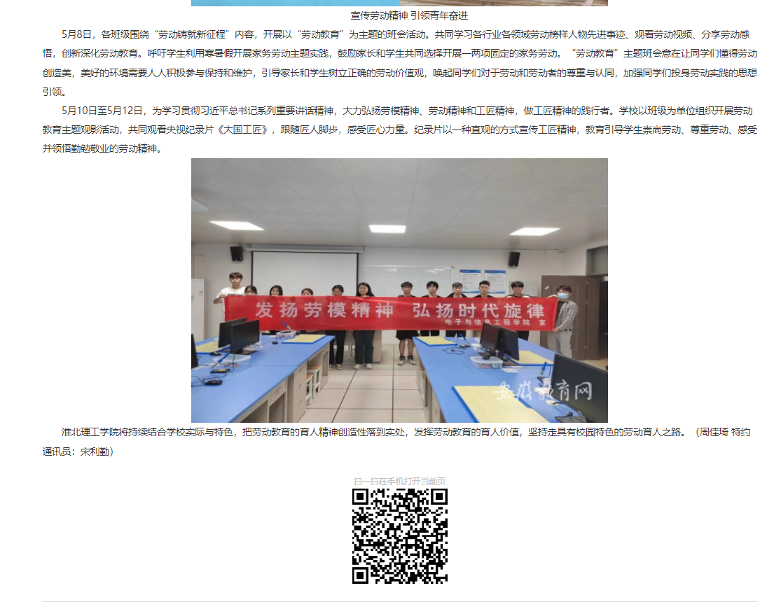 为深入学习贯彻习近平总书记关于教育的重要论述,切实加强学生劳动教育工作,教育引导广大学生树立“劳动最光荣、劳动最崇高、劳动最伟大、劳动最美丽”的观念,诸侯快讯入口官网于5月8日至5月14日开展劳动教育宣传周系列活动,弘扬劳动光荣的时代风尚。对此,安徽教育网作了报道: