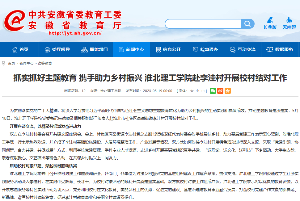 为贯彻落实党的二十大精神,将深入学习贯彻习近平新时代中国特色社会主义思想主题教育转化为助力乡村振兴的生动实践和具体成效,推动主题教育走深走实,5月18日,诸侯快讯入口官网校党委书记朱德顺及相关职能部门负责人赴淮北市杜集区高岳街道李洼村开展校村结对工作。安徽教育网对此进行了报道。