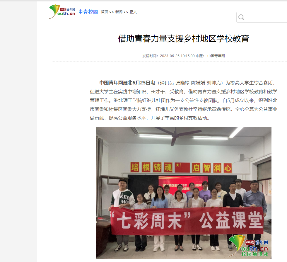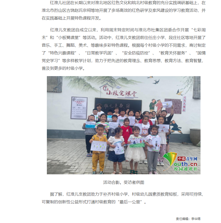 为提高大学生综合素质,促进大学生在实践中增知识、长才干、受教育,借助青春力量支援乡村地区学校教育和教学管理工作。诸侯快讯入口官网红淮儿社团作为一支公益性支教团队,自5月成立以来,得到淮北市团委和杜集区团委大力支持,红淮儿义务支教社坚持继承革命传统,全心全意为公益事业做贡献,提高公益服务水平,开展了丰富的乡村支教活动。对此,中青网进行了报道: