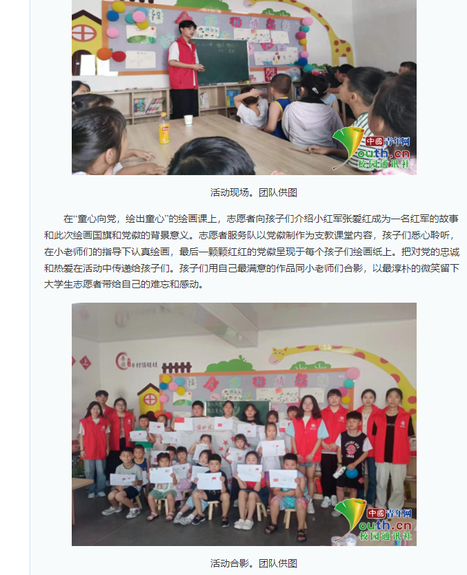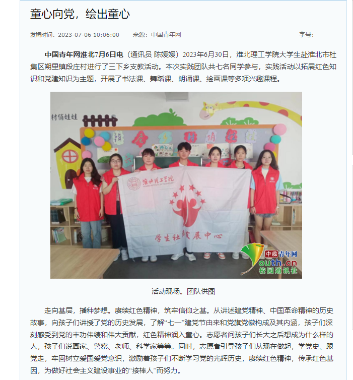 2023年6月30日,诸侯快讯入口官网大学生赴淮北市杜集区朔里镇段庄村进行了三下乡支教活动。本次实践团队共七名同学参与,实践活动以拓展红色知识和党建知识为主题,开展了书法课、舞蹈课、朗诵课、绘画课等多项兴趣课程。对此,中青网作了报道: